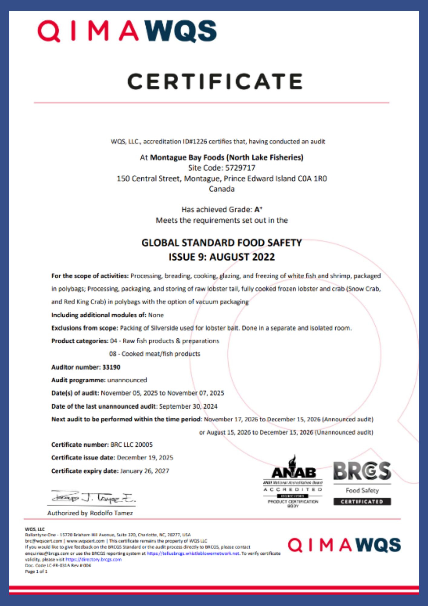4. RECENT OVERVIEW: Today, North Lake Fisheries (2013) Inc. operates two processing facilities—one in North Lake (Elmira) and another in Montague, PEI. The company specializes in wild-caught Atlantic lobster, snow crab, breaded fish fillets, and other value-added seafood products. These are processed primarily for export to global markets. It maintains key certifications such as HACCP, MSC, and BRC, which affirm its commitment to food safety, traceability, and sustainability.