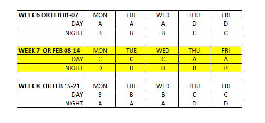 WORK SCHEDULE: JAN 08-14 2026